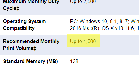 It supports automatic two-sided printing, borderless printing and prints at the speed of 12.0 ppm (6.0 ppm in color). It's recommended montly page volume is 525 and maximum allowed page volume is 2500.