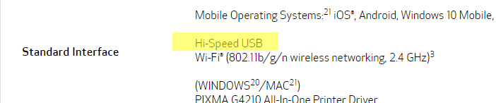 Canon Pixma G4210 allows printing via Wi-Fi, a mobile phone/tablet, AirPrint, a USB cable and an Ethernet cable.