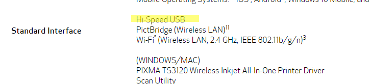 Canon TS3120 allows printing via Wi-Fi, a mobile phone/tablet, AirPrint, a USB cable and an Ethernet cable.