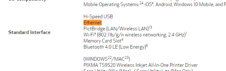 Canon Pixma TS9520 allows printing via Wi-Fi, a mobile phone/tablet, AirPrint, a USB cable, an Ethernet cable and Bluetooth.