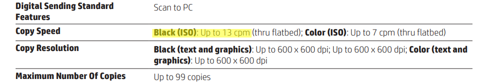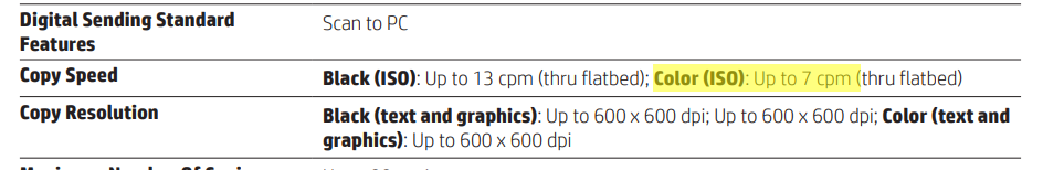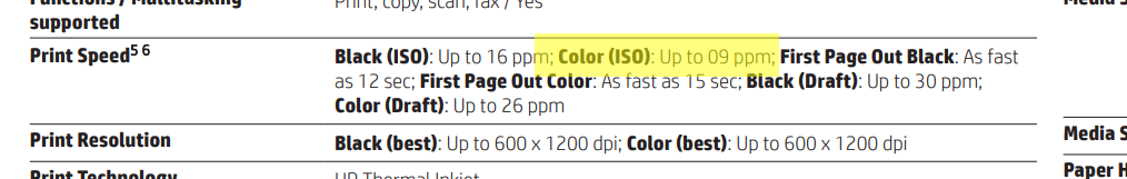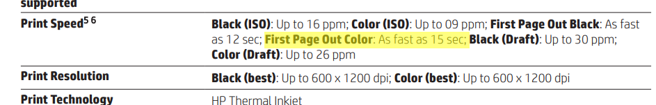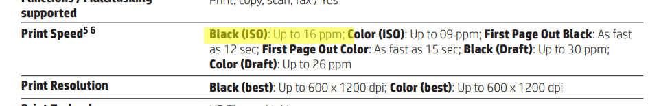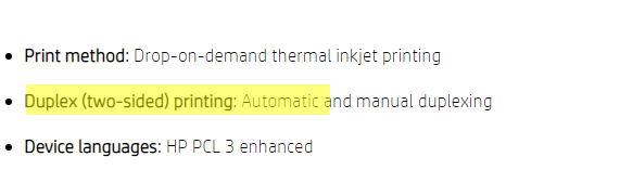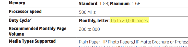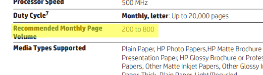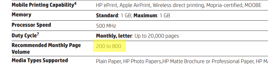 It supports automatic two-sided printing, borderless printing and prints at the speed of 16.0 ppm (9.0 ppm in color). It's recommended montly page volume is 500 and maximum allowed page volume is 20000.