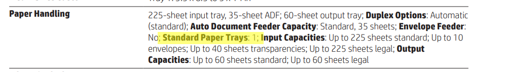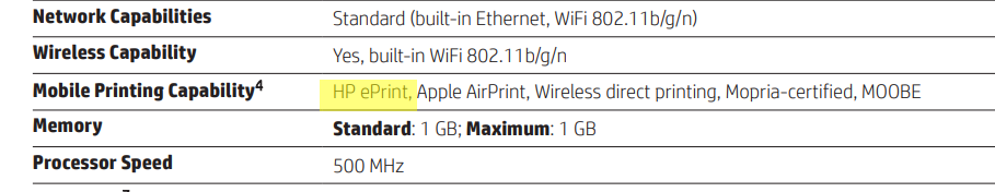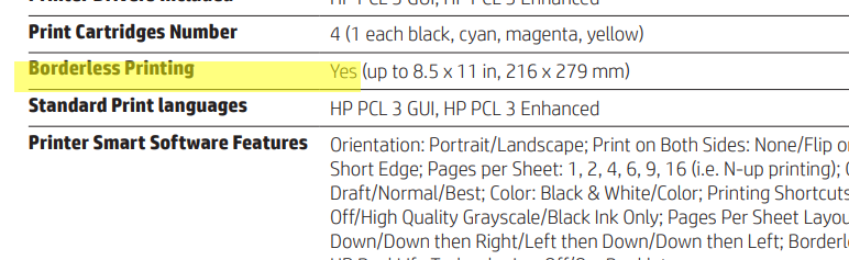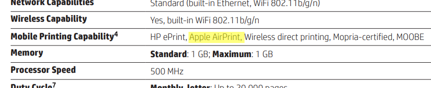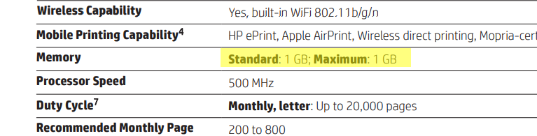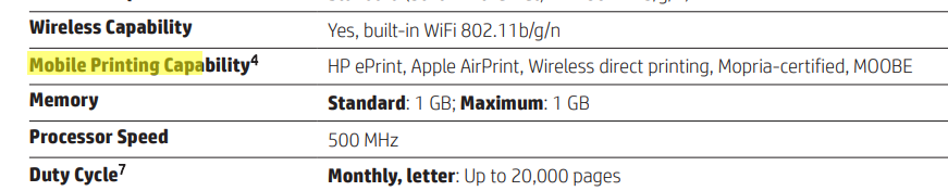 It supports automatic two-sided printing, borderless printing and prints at the speed of 18.0 ppm (10.0 ppm in color). It's recommended montly page volume is 500 and maximum allowed page volume is 20000.