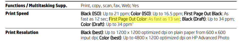It supports automatic two-sided printing, borderless printing and prints at the speed of 21.0 ppm (16.5 ppm in color). It's recommended montly page volume is 875 and maximum allowed page volume is 30000.