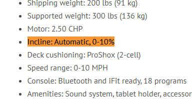 Whether manual or automatic, treadmills will be rated with a maximum incline and minimum decline. This is reported as a percentage grade—a number that measures the slope of the surface. The higher the percentage, the stronger the angle or slope. Most treadmills will have a maximum incline around 12%. Less common are treadmills that can simulate a decline or walking downhill, which can use muscles that usually don’t get attention in standard cardio workouts. For these machines, there will be a lowest decline number reported as a negative percentage grade.